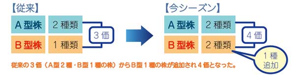 近年のインフルエンザの流行は、A型に加えB型の混合流行が続いており、WHOも4価ワクチンを推奨しています。そのことから、日本においても今シーズンより4価が採用されることとなりました。